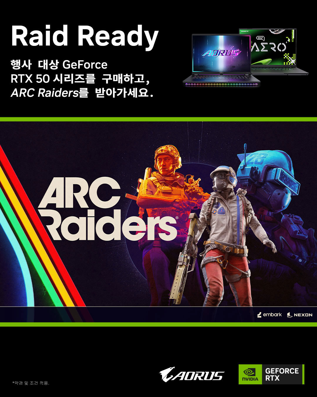2025년 10월 7일부터 11월 4일까지, NVIDIA GeForce RTX5070 이상 GPU를 탑재한 최신 기가바이트 노트북(AERO X16 1WH/2WH, AORUS MASTER 18) 구매자에게 기대작 ‘ARC Raiders(아크 레이더스)’ 게임 번들을 증정하는 프로모션을 진행합니다.